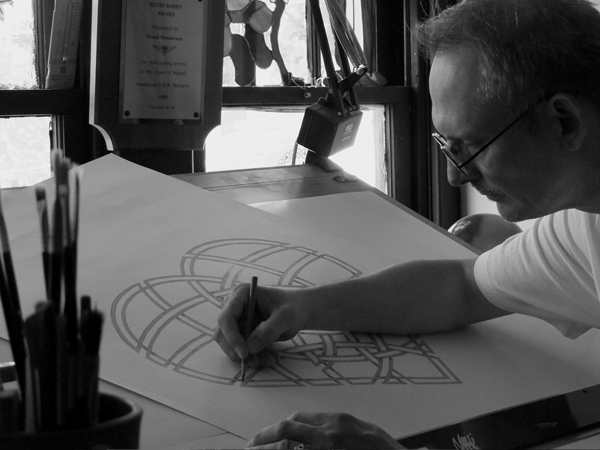 In digital, using Adobe Illustrator on Apple Computers, he has created hundreds of custom made designs based on hand drawn pencil sketches. These designs are printed onto Epson Bright White Watercolor Papers.